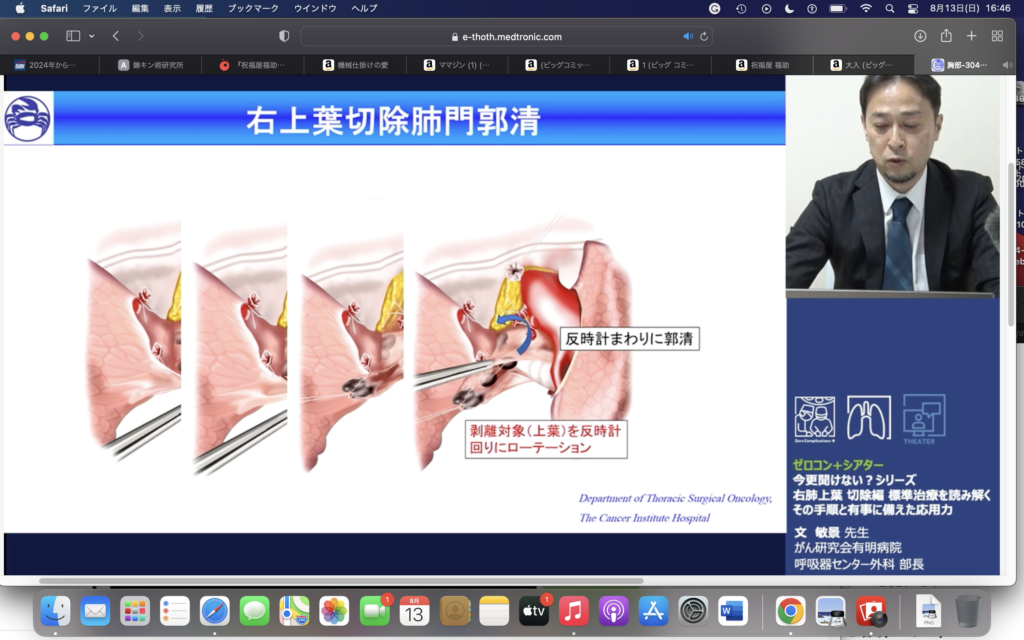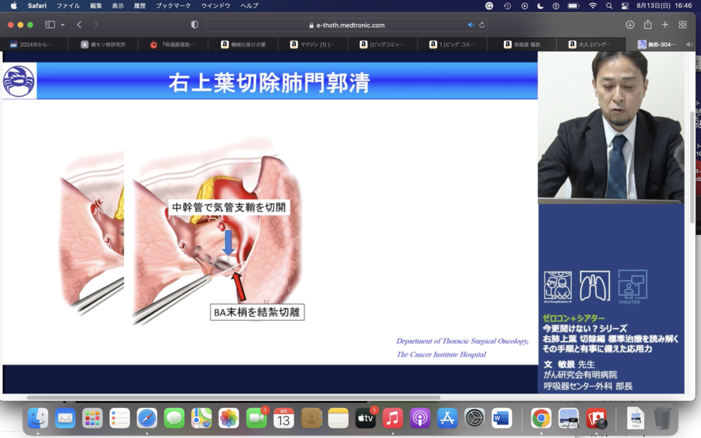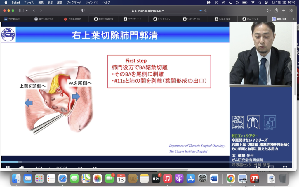 ↑広く準備して、切るもの(血管)切って、葉間作ってから、肺門郭清して、気管支切る。
