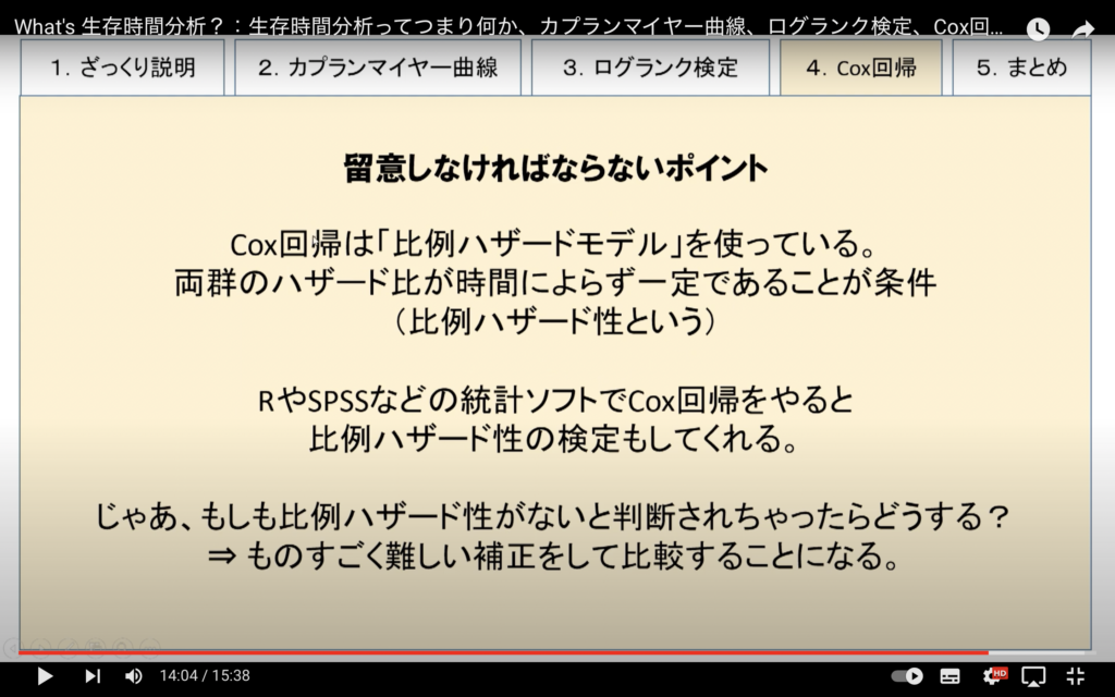 (https://www.youtube.com/watch?v=oQQUSsWS4lE)単変量の場合は、ログランク検定をやってもいいし、Cox単変量解析をやってもよいです。p値もほぼ同じ。