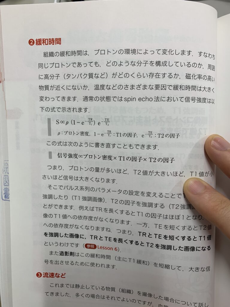 画像化されているのはプロトンの量(密度)だけではない。状態や環境によっても変わってくる。それを記述する「緩和」という概念がある。緩和には2種類。T1緩和とT2緩和。