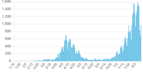 本当に第二波(?)が来たなら、第二波(?)が始まる7月10日あたりから、増えてきていないとおかしいですね。(細かいことをいうと、コロナは発症してから10日ほどで重症化するので、遅くても7月末くらいには4月半ばくらいのペース(もしくはそれ以上のペース)で死者数が激増してこないといけないはずです。しかし、7月終わりからの累計死者数の上り方をみても、そうはなっていない。