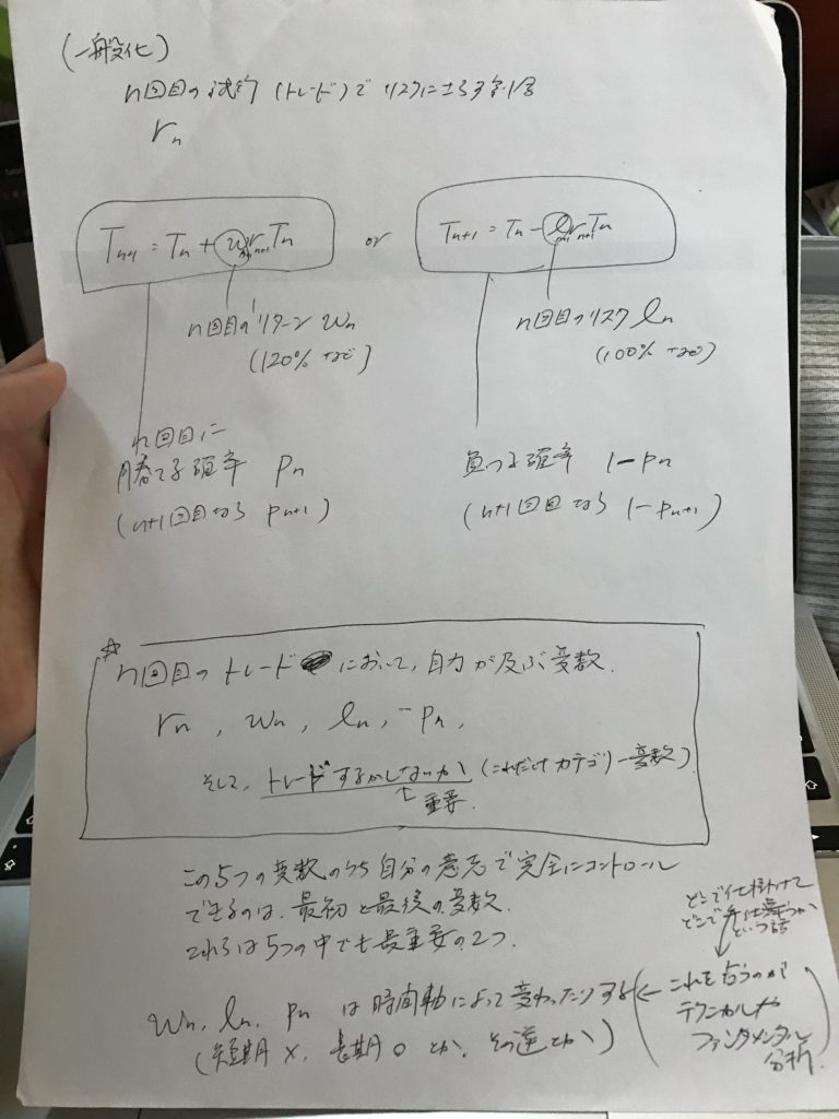 為替・株 【保存版】トレードの本質=短期でも長期でもトレードはトレード。数学大事!=確率と数列の問題。反復試行の確率の問題ではなかった。二次関数絡む。=厳しい世界だなー=積み立ても絶対安全ではない!が、時間のメリットを二重で享受できる(時間を味方につける、時間が自分のものになって、トレード以外のことに自分の時間を使える) 2023年12月22日 2023年12月22日 Toshi Facebook Twitter Google+ はてブ Pocket Feedly ああ、最高だ。 ・どれぐらいキャッシュで持てばいいかなんて、その時によって変わる。 ・年代によっても変わる(その人の年齢によって、あと何回トレードできるか?が違う) 死人はトレードできない! 人によってリスク許容度が異なるゆえん。 ・トレードしないという選択も立派な投資。 ・wn やln 、pnが曖昧なままトレードしたら負けるよね。笑 ・トレードしなければその時間が他のことに使える。もっと生産的なこと。 Facebook Twitter Google+ はてブ Pocket Feedly