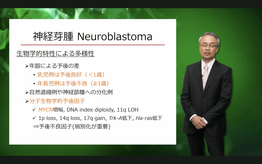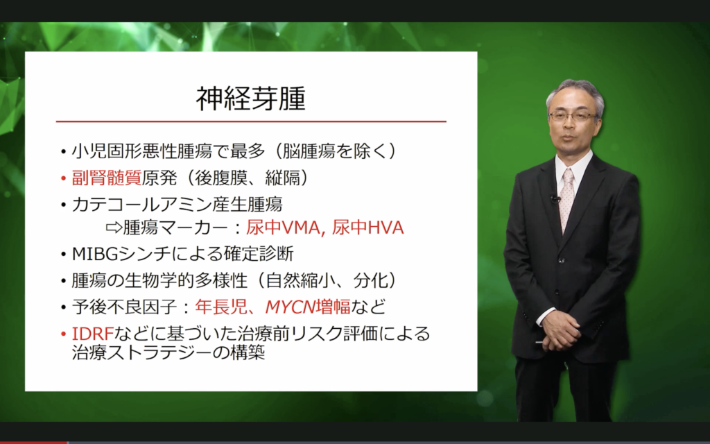 一応疾患は限られてはいるんだな。神経芽腫…副腎髄質原発。固形腫瘍の中で、脳腫瘍の次に多いの!カテコラミン産生腫瘍。尿中VMAやHVAは腫瘍マーカーになる。MIBGシンチで確定診断。腫瘍の生物学的多様性あり。IDRF?でリスクを評価して、治療戦略をたてるの。