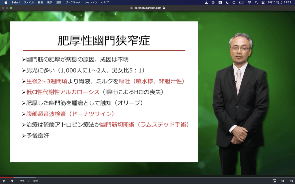 ひこうせい幽門狭窄ピロステ男児に多い2-3週間くらいで胃液やミルクを吐く。電解質バランス崩れる。Cl減ってあるかろーしすオリーブドーナツサイン