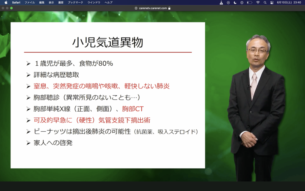 ピーナッツは摘出後肺炎の可能性。油分が溶け出すから。抗菌薬、吸入ステロイド