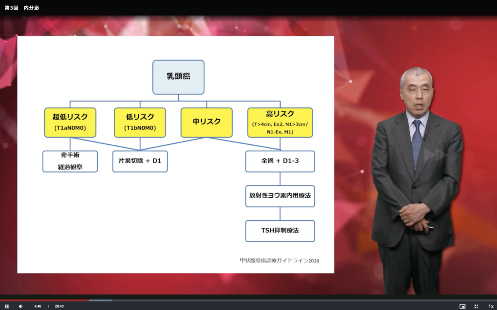 低リスクに対しては、機能温存。片葉切除高リスクに対しては、全摘、リンパ節郭清、放射性沃素内服、TSH抑制療法も