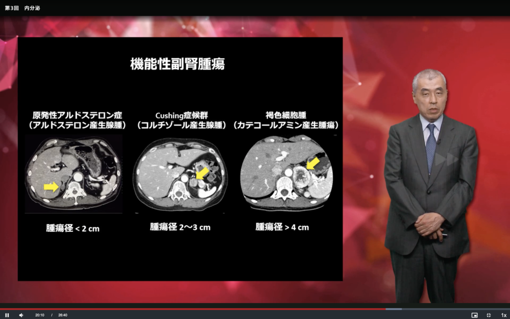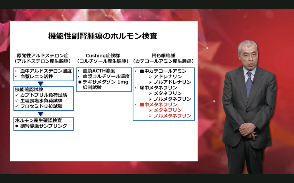 <機能性副腎腫瘍…副腎の外科診療>大きさで大体わかる。原発性アルド…<2cm アルドレニン測って、機能確認して、ホルモン産生確認クッシング…2-3cm デキサ抑制フェオ…4cmこえる血中メタネフリンはかる