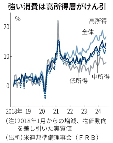 ただ経済指標で好調に映る経済の内側にはゆがみが残ったままだ。ハリス氏は公約で児童税額控除の拡大など中間層重視を前面に掲げるが、前回の大統領選でバイデン氏が主張した政策を実現できなかった重荷を負う。民主の岩盤だった黒人やヒスパニックで比較的所得の低い層の支持離れが指摘される。