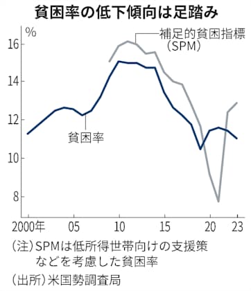 米国勢調査局が9月に公表した23年の貧困率も厳しい現実を突きつける。実態に即した貧困率を示すとされる「補足的貧困指標(SPM)」でみると、全体の12.9%にあたる4284万人が貧困状態だった。これは6年ぶりの高水準だ。