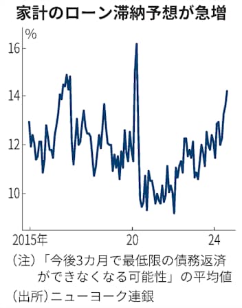 足元ではクレジットカードや自動車ローンを支払えない家庭が増えている。ニューヨーク連銀の9月の調査では「今後3カ月で最低限の債務返済ができなくなる可能性」の平均値が14.2%に跳ね上がった。40〜50代、高卒以下の学歴の人で伸びが際立つ。
