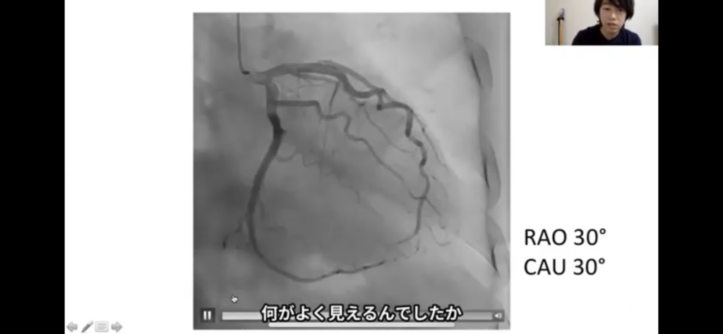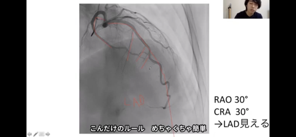 ↑全体として右下に向かっているのでRAO、全体的に右上にいることからあきらかにCAUではない。CRAだ。心尖までいってるやつがLAD。よくみたら中隔枝ある。