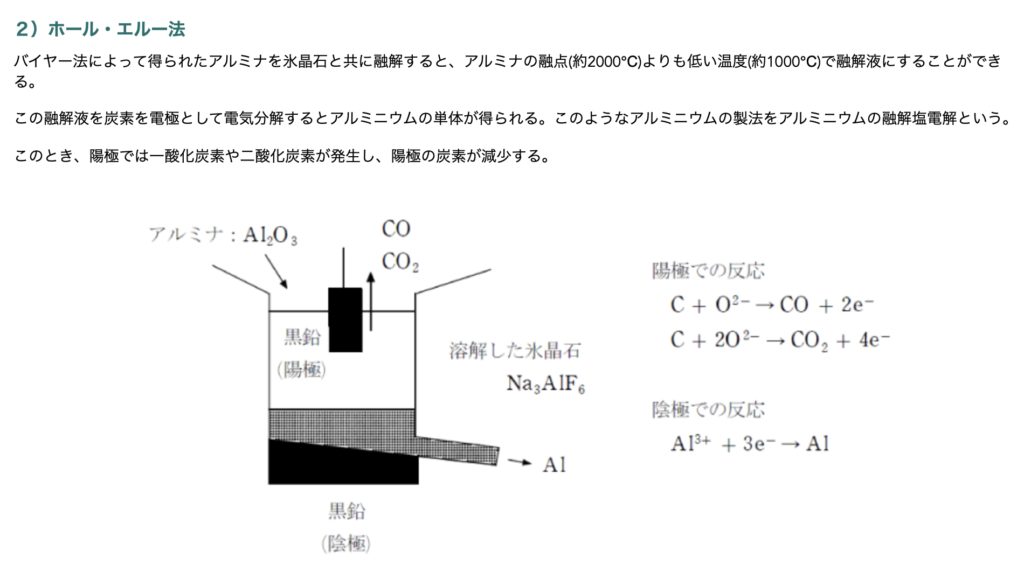 ボーキサイト→アルミナ=酸化アルミニウム(Al2O3)→水酸化アルミニウム→(融解塩電解:炭素電極で)→アルミニウム
